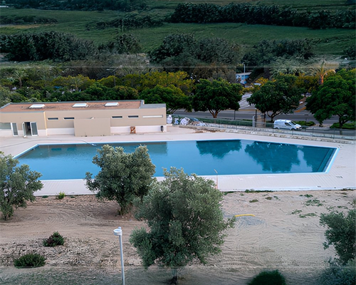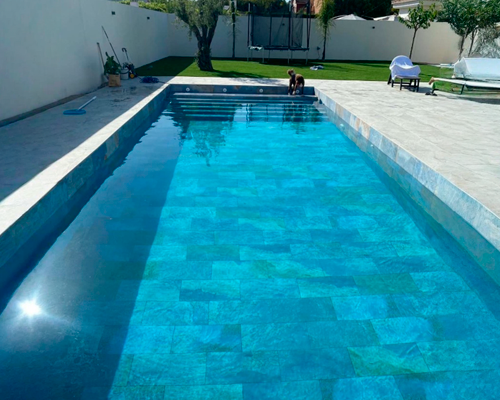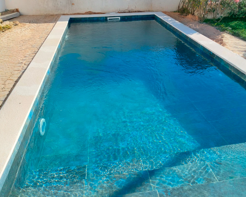 Esta piscina de grande dimensão foi totalmente renovada. De um espaço degradado, ganhou uma nova vida com um revestimento moderno, mais seguro e visualmente apelativo. Uma transformação que alia funcionalidade e durabilidade.