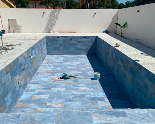 Construção de uma piscina com revestimento em tons naturais Apesar de só estarem disponíveis imagens do processo de execução, o projeto final destaca-se pela sua elegância discreta, qualidade nos acabamentos e atenção aos detalhes.